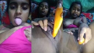 18 साल की लड़की जवान होते ही लेने लगी है मजे हस्तमैथुन का. जब उसको चुत मे डालने के लिये कुछ सामान नहीं मिला तो घर पे पड़े डिल्डो आकर का एक सामान को होममेड डिल्डो बना ली है. गाँव की गरीब घर की लड़की है डिल्डो खरीदने का पैसा नहीं होने के कारण होममेड डिल्डो से ही काम चलाना पड़ रहा है इस बिचारी लड़की को. कोई इसको ऑनलाइन डिल्डो खरीद इसके घर पे डिलीवर करवा दो ताकि हस्तमैथुन तो सही से कर पाए ये लड़की. खैर हमें क्या हमें तो इसकी टाइट चुत देखने से मतलब है. लड़की पहले तो अपने टाइट बूब्स को दबाते हुए खुद ही अपने टाइट बूब्स को चूस मजा लेने लगी. फिर वो अपनी टाँगे फैला अपनी चिकनी टाइट काली चुत को खोलती है. फिर होममेड डिल्डो को अपनी चुत मे अंदर बाहर करने लगी. जल्दी जल्दी चुत मे लड़की डिल्डो को अंदर बाहर कर हस्तमैथुन का मजा लेने लगी.